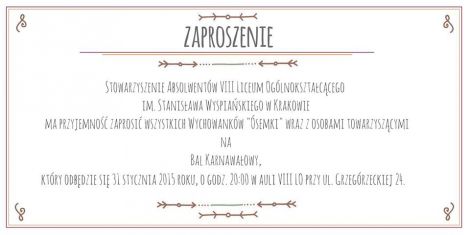 31 stycznia 2015r. w VIII Liceum Ogólnokształcącym im. Stanisława Wyspiańskiego przy ul. Grzegórzeckiej 24 w Krakowie odbędzie się Bal Absolwentów „Ósemki”. Będzie to doskonała okazja nie tylko do odnowienia kontaktów z kolegami i koleżankami z czasów licealnych oraz integracji środowiska absolwenckiego, ale także do refleksji nad niemal 60-letnią historią szkoły.