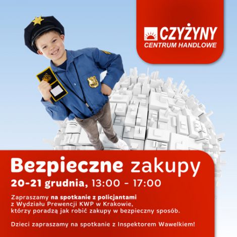 W okresie przedświątecznym policjanci z Wydziału Prewencji KWP w Krakowie przeprowadzają kampanię edukacyjną „Bezpieczne zakupy”. W dniach 20-21 grudnia 2014 roku w godz. 13:00 – 17:00 policjanci odwiedzą Centrum Handlowe Czyżyny, udzielając porad dotyczących bezpieczeństwa w okresie świątecznych przygotowań.