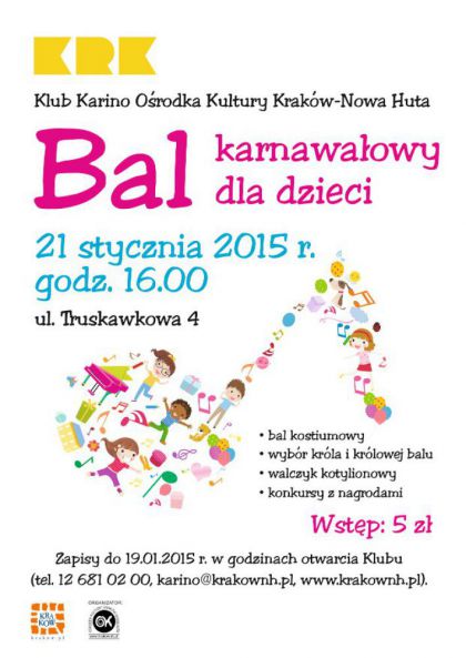 Klub Karino Ośrodka Kultury Kraków-Nowa Huta zaprasza na bal karnawałowy dla dzieci i młodzieży uczestniczącej w zajęciach Klubu. Uczestnicy balu proszeni są o przybycie w strojach karnawałowych lub przebranie się za postaci z ulubionych bajek. W programie imprezy zabawy i konkursy z nagrodami, wybór króla i królowej balu oraz walczyk kotylionów.