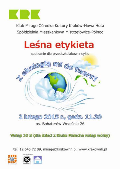 Zajęcia z cyklu Z ekologią mi do twarzy to cykl zajęć edukacyjnych dla dzieci w wieku przedszkolnym o tematyce ekologicznej w Klubie Mirage Ośrodka Kultury Kraków-Nowa Huta. Pierwsze zajęcia poświęcone będą leśnej etykiecie, czyli temu co wolno a czego nie podczas spacerów po lesie. Dzieci dowiedzą się jak należy zachowywać się w stosunku do zwierząt i roślin oraz jak zadbać o własne bezpieczeństwo.