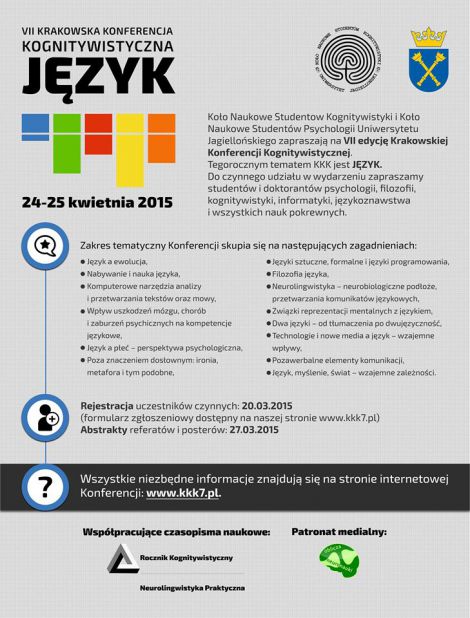 Tematem przewodnim VII Krakowskiej Konferencji Kognitywistycznej będzie “Język”. Odbędzie się ona w dniach 24-25.04.2015 r. w Instytucie Psychologii UJ przy ul. Ingardena 6 w Krakowie. Konferencja jest organizowana przez Koło Naukowe Studentów Kognitywistyki UJ oraz Sekcję Neuropsychologii Koła Naukowego Studentów Psychologii UJ.