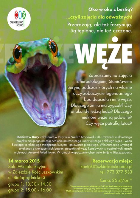 Zapraszamy na zajęcia z herpetologiem, podczas których na własne oczy zobaczycie legendarnego boa dusiciela i inne węże. Dlaczego żmija ma zygzak? Czy anakondy jedzą ludzi? Dlaczego niektóre węże są jadowite? Czy węże potrafią latać?