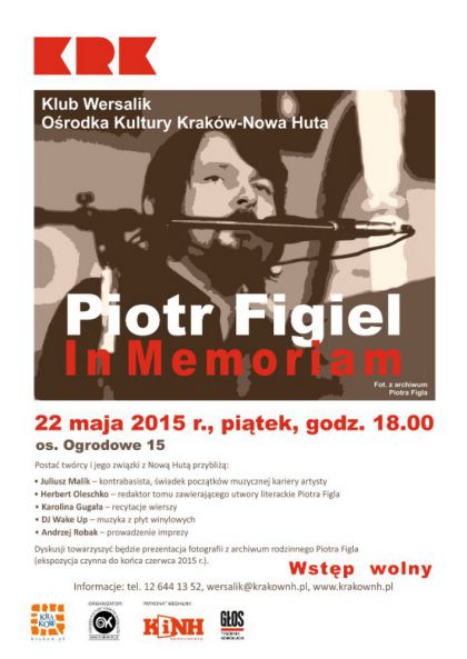 Klub Wersalik Ośrodka Kultury Kraków-Nowa Huta (os. Ogrodowe 15) zaprasza 22 maja na godz. 18.00 na wieczór poświęcony pamięci Piotra Figla - pianisty, kompozytora, aranżera, autora piosenek i muzyki filmowej, a także poety. Postać twórcy i jego związki z Nową Hutą przybliżą Juliusz Malik, kontrabasista, świadek początków muzycznej kariery artysty i Herbert Oleschko, redaktor tomu zawierającego utwory literackie Piotra Figla, które zarecytuje Karolina Gugała. Dyskusji towarzyszyć będzie prezentacja fotografii z archiwum rodzinnego bohatera wieczoru, jego wierszy i muzyki odtwarzanej z płyt winylowych w wykonaniu DJ Wake UP. Spotkanie poprowadzi Andrzej Robak.
