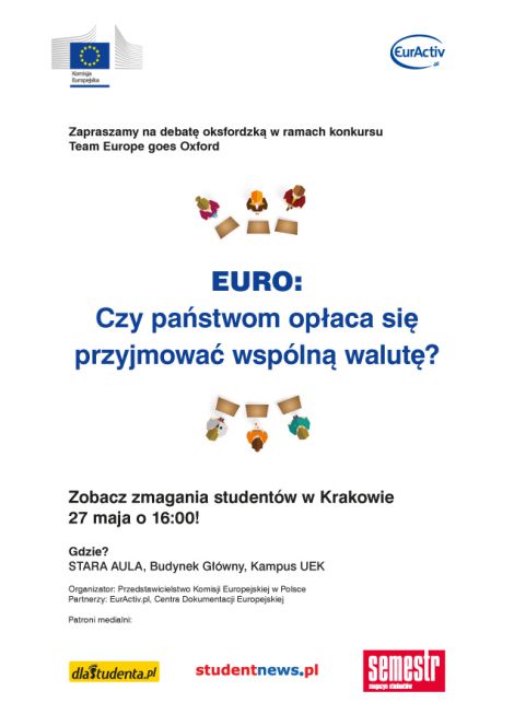 Debata oksfordzka Komisji Europejskiej, podczas której studenci UJ i UEK będą debatować na temat: Euro: czy państwom opłaca się przyjmować wspólną walutę?
