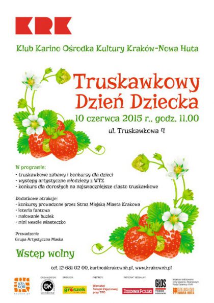 Klub Karino Ośrodka Kultury Kraków-Nowa Huta (ul. Truskawkowa 4) zaprasza 10 czerwca o godz. 11.00 na najsmaczniejszy i najzdrowszy festyn rodzinny w całym Krakowie! Jak co roku Klub Karino zapewnia moc atrakcji i zaprasza na wspólne świętowanie. Będą zabawy dla najmłodszych oraz bezpłatne wesołe miasteczko, a dla dorosłych konkurs kulinarny na najsmaczniejsze ciasto truskawkowe. W tym dniu królować będą TRUSKAWKI. Regulamin i karta zgłoszenia do pobrania na www.krakownh.pl.