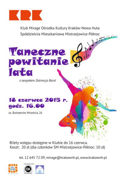 Lato najlepiej powitać tanecznym krokiem, w rytmie przebojów wygrywanych przez Dalmacja Band. Na kolejną zabawę taneczną z zespołem na żywo, która odbędzie się 18 czerwca godz. 17.00, zapraszają Klub Mirage Ośrodka Kultury Kraków-Nowa Huta (os. Bohaterów Września 26) i Spółdzielnia Mieszkaniowa Mistrzejowice-Północ. Bilety dostępne w Klubie do 16 czerwca.
