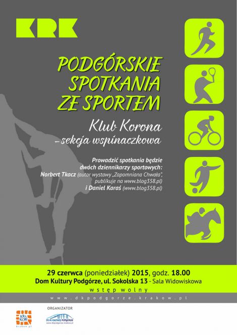 „Podgórskie spotkania ze sportem" to cykl wykładów dotyczących szeroko pojętej historii sportu na Podgórzu i w Krakowie. Nie będziemy unikać tematów politycznych, architektonicznych czy obyczajowych. Nie będzie ograniczać nas również forma spotkań, będą one otwarte dla publiczności - dla Was, jako aktywnych uczestników, będziemy prowadzić dyskusje i dzielić się wspomnieniami. Zapraszać będziemy gości, którzy byli świadkami lub uczestnikami danego wydarzenia. Zaprezentujemy dokumentację minionych wydarzeń każdej formie – zdjęcia, filmy oraz materiały radiowe.