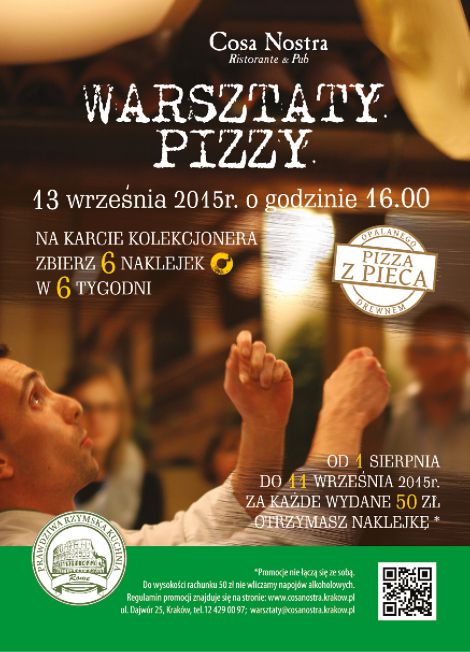 W jaki sposób weźmiecie udział w warsztatach? Restauracja przygotowała specjalne Karty Kolekcjonera, na które należy przykleić 6 naklejek. Naklejkę dostajemy za każde wydane 50 zł. Gdy uzbieramy komplet to po prostu oddajemy kelnerowi Kartę Kolekcjonera, wpisujemy się na listę i gotowe. 13 września bierzemy udział w Warsztatach Pizzy. Jeżeli jednak nie macie możliwości, aby wydać w Cosa Nostra 6 razy 50 zł, to wystarczy, że zapłacicie 100 zł i zapiszecie się na listę.