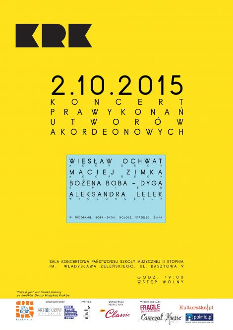 Koncert Prawykonań Utworów Akordeonowych odbędzie się 2 października 2015 r. o godz. 19:00 w sali koncertowej Państwowej Szkoły Muzycznej II st. im. Władysława Żeleńskiego, ul. Basztowa 9 w Krakowie. Wydarzenie ma na celu prezentację wysokiej jakości artystycznych kompozycji z udziałem akordeonu jeszcze nie prezentowanych publicznie, stworzonych przez młodych krakowskich kompozytorów. W II edycji koncertu zostaną wykonane utwory krakowskich kompozytorów, zdobywców nagród i wyróżnień na konkursach kompozytorskich: Bożeny Boba-Dyga, Juliana Gołosza, Szymona Strzelca oraz Macieja Zimki. W programie: Szymon Stanisław Strzelec : Stadia Lazuru w czerni i bieli na akordeon, wiolonczelę i warstwę elektroakustyczną (2013-2014), Maciej Zimka: Schwarzer Weg na wiolonczelę i akordeon (2013), Sonata na akordeon (2015), Between Paths na akordeon (2015), Julian Gołosz: Dissoi logoi na dwa akordeony i niemuzyka (2015), Bożena Boba-Dyga: Kształty na głos, wiolonczelę i dwa akordeony (2015). Wykonawcami koncertu będą: Wiesław Ochwat (akordeonista, zwycięzca wielu prestiżowych nagród na konkursach instrumentalnych, obecnie doktorant Akademii Muzycznej w Krakowie), Maciej Zimka (akordeonista i kompozytor, zdobywca wielu nagród na konkursach w kraju i zagranicy, stypendysta Stypendium Twórczego Miasta Krakowa) Bożena Boba - Dyga (artystka polisensoryczna: śpiewaczka, poeta, konserwator dzieł sztuki i designer) oraz Aleksandra Lelek (wiolonczelistka, zdobywca wielu prestiżowych nagród na międzynarodowych konkursach wiolonczelowych, obecnie doktorantka w Akademii Muzycznej w Krakowie, stypendystka Stypendium Twórczego Miasta Krakowa). Wstęp na wydarzenie jest wolny.