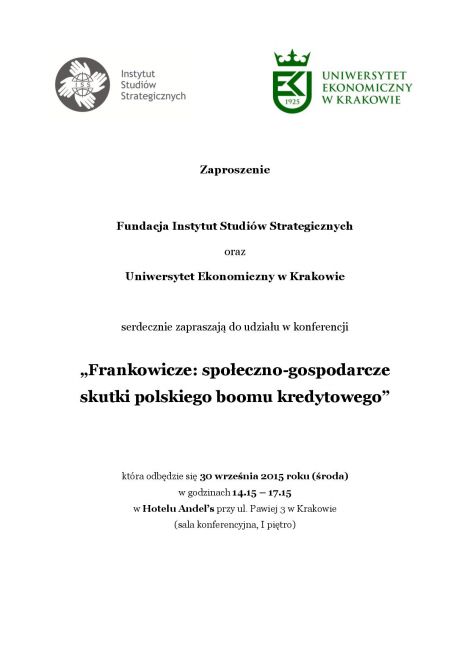 Fundacja Instytut Studiów Strategicznych oraz Uniwersytet Ekonomiczny w Krakowie serdecznie zapraszają do udziału w konferencji „Frankowicze: społeczno-gospodarcze skutki polskiego boomu kredytowego”.