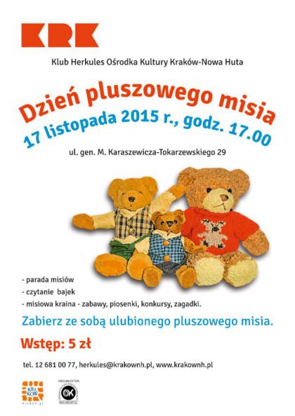 Klub Herkules Ośrodka Kultury Kraków-Nowa Huta (ul. gen. M. Karaszewicza-Tokarzewskiego 29) zaprasza dzieci na imprezę z okazji obchodów Światowego Dnia Pluszowego Misia. Miś to nie tylko pluszowa przytulanka, to ,,ktoś” bardzo bliski, i często niezastąpiony. Miś jest przyjacielem dzieci, czy zatem wypada zapomnieć o urodzinach przyjaciela? W programie wspólnej zabawy znajdą się parada misiów, konkurs plastyczny pt. Narysuję misia, czytanie bajek, misiowe zabawy, piosenki, zagadki. Zachęcamy dzieci do przyniesienia ze sobą ulubionego pluszowego misia. Spotkanie odbędzie się 17 listopada o godz. 17.00.