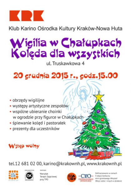 Klub Karino Ośrodka Kultury Kraków-Nowa Huta (os. Chałupki, ul. Truskawkowa 4) zaprasza na integracyjną wigilię w osiedlu Chałupki organizowana w ramach mini-grantu II edycji konkursu Wkrętak! Wkręć siebie i innych w działanie. Zapraszamy mieszkańców Chałupek i okolicy do ogrodu przy osiedlowej figurce Matki Bożej w dniu 20 grudnia o godz. 15.00. W programie spotkania: tradycyjne obrzędy wigilijne, śpiewanie kolęd oraz niespodzianki pod choinką dla wszystkich uczestników. Partnerem wydarzenia jest Warsztat Terapii Zajęciowej przy Towarzystwie Przyjaciół Dzieci.