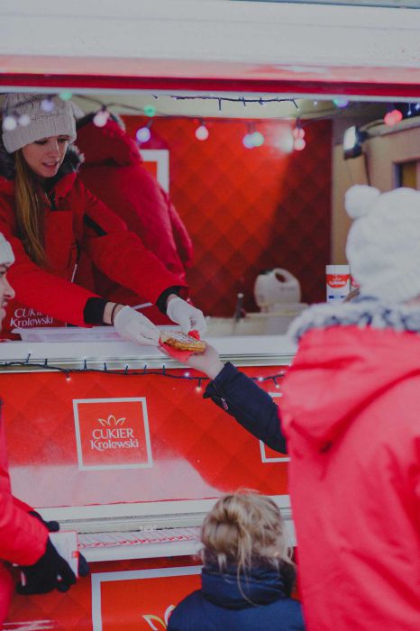 Na co możesz liczyć biorąc udział w wydarzeniu? Na uśmiech, komplement, serdeczny uścisk lub sympatyczne życzenia od nieznajomych. Jeśli odwdzięczysz się tym samym, otrzymasz cieplutkiego gofra z cukrem pudrem Cukier Królewski. Dodatkowo, pierwszych 500 życzliwych i serdecznych osób, które przyjdą na spotkanie z ekipa akcji „Słodkie gesty”, również szablony do dekoracji domowych wypieków. Koniecznie wypróbuj również czerwony guzik umieszczony na gofrobusie. Najpierw przygotuj jednak aparat do zrobienia selfie, bo… zacznie padać śnieg!