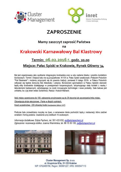 Bal jest organizowany jako spotkanie integracyjne środowiska oraz w celu nadania blasku i prestiżu kontaktom biznesowym. Termin i miejsce balu nie są przypadkowe. W XIX w. Pałac Spiski rywalizował z Pałacem Potockich "Pod Baranami" i możemy przyczynić się do powrotu tradycji, ponieważ 6 lutego 2016r. w Pałacu Potockich odbywać się będzie doroczny Bal Adwokata i Lekarza. Biznesmeni zgromadzeni w Pałacu Spiskim stanowić będą elitę środowiska działającego w powiązaniach kooperacyjnych, utrzymującego stały kontakt z nauką i laboratoriami badawczymi, wdrażającego na rynek innowacyjne technologie i nowe produkty. Sala balowa jest unikalna, bo z jej okien widać Sukiennice, Ratusz i Kościół Mariacki.