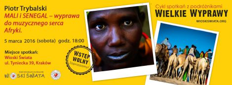 Afryka Zachodnia, mimo, że ostatnimi czasy nękana doniesieniami o kolejnych porwaniach obcokrajowców, głównie turystów oraz powstaniami, wciąż stanowi niesamowitą pokusę dla wszelkiej maści globtroterów, podróżników i innych, których urzekły opowieści Mungo Parka. Wielkim skarbem regionu jest muzyka. Takie nazwiska jak Ali Farka Touré, Toumani Diabaté, czy zespół Tinariwen są już całkiem dobrze znane w muzycznych kręgach Europy i obu Ameryk. To właśnie tym muzycznym szlakiem wybierzemy się do Mali, na Festiwal Pustyni, który co roku odbywa się na pustyni niedaleko magicznego Timbuktu. Odwiedzimy tajemniczych Dogonów, dotkniemy Ręki Fatimy, spłyniemy Nigrem i przespacerujemy się w cieniu największego, glinianego meczetu Afryki w Djenne. Towarzyszyć nam będzie muzyka, dużo fotografii i opowieści.