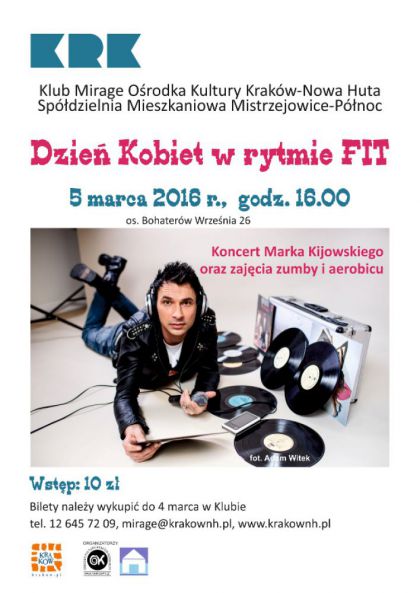 Drogie Panie, nieśmiało skrada się ku nam wiosna a już za kilka dni będziecie obchodzić Wasze święto. Z tej właśnie okazji chcemy Was zaprosić na Dzień Kobiet w rytmie Fit do Klubu Mirage Ośrodka Kultury Kraków-Nowa Huta (os. Bohaterów Września 26). Od godz. 16.00 do 20.00 instruktorzy czekają na wszystkie zwolenniczki zdrowego i aktywnego stylu życia oraz dobrej zabawy. W programie m.in. zajęcia aerobiku i zumby a po fitnesowych zmaganiach czarować będzie swoim głosem Dj Maros. Spalone w trakcie zajęć fitness kalorie uzupełni pyszne ciacho a każda pani wróci do domu z drobnym upominkiem. Nie może Was zabraknąć. Zaproszenia do odbioru w Klubie do 4 marca br.