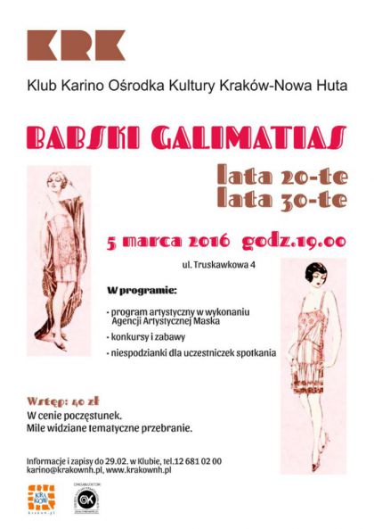 Kolejna impreza dla kobiet z cyklu Babski Galimatias w Klubie Karino Ośrodka Kultury Kraków-Nowa Huta (ul. Truskawkowa 4). Tym razem w stylu lat 20. i 30., zorganizowana również z okazji święta wszystkich pań, odbędzie się w sobotę 5.03. o godz. 19.00. Podczas imprezy odbędzie się pokaz mody oraz konkurs na najciekawszy strój z lat 20. i 30. Nie zabraknie ciekawych zabaw i konkursów, które poprowadzi lubiany przez uczestniczki „babskich imprez” Radosław Omieciński. Ciekawy program artystyczny, pyszny poczęstunek, a przede wszystkim duża dawka dobrego humoru gwarantują, że impreza będzie udana.
