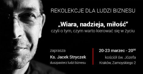 Zapraszamy na rekolekcje dla ludzi biznesu "Wiara, nadzieja, miłość". Wygłosi je ksiądz Jacek Stryczek - prezes Stowarzyszenia WIOSNA (organizatora akcji Szlachetna Paczka), duszpasterz ludzi biznesu.