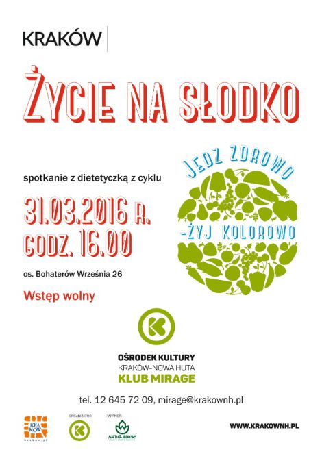 Klub Mirage Ośrodka Kultury Kraków-Nowa Huta (os. Bohaterów Września 26) zaprasza 31 marca na godz. 16.00 na kolejne spotkanie dla seniorów z cyklu Jedz zdrowo-żyj kolorowo, promującego zdrowy styl życia. Zdrowe odżywianie to nie tylko liczenie kalorii. Zbilansowana dieta i aktywność fizyczna przyczyniają się do lepszej jakości życia i zapobiegają wielu chorobom. Uczestnicy spotkania dowiedzą się jakie składniki w diecie będą przeciwdziałać problemom ze zdrowiem, a których należy się wystrzegać oraz jak ograniczyć ryzyko niedoboru witamin. Dietetycy pokażą jak komponować posiłki aby wspomagały sprawność fizyczną, psychiczną oraz spowalniały procesy starzenia. Spotkania poprowadzą eksperci z Centrum Dietetycznego Naturehouse - światowego lidera w dziedzinie dietetyki i żywienia.