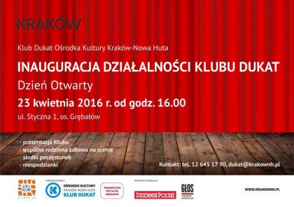 Ośrodek Kultury Kraków-Nowa Huta oraz Towarzystwo Przyjaciół Grębałowa zapraszają na inauguracja działalności Klubu Dukat Ośrodka Kultury Kraków-Nowa Huta (ul. Styczna 1) po generalnym remoncie. W sobotę 23 kwietnia od godziny 16.00 Klub będzie otwarty dla wszystkich. Można będzie zobaczyć, jak teraz wygląda, dowiedzieć się, jakie propozycje przygotował Klub na najbliższe miesiące a także wziąć udział we wspólnej zabawie tanecznej. Na wszystkich gości czekać będzie słodki poczęstunek, przygotowany przez Towarzystwo Przyjaciół Grębałowa.