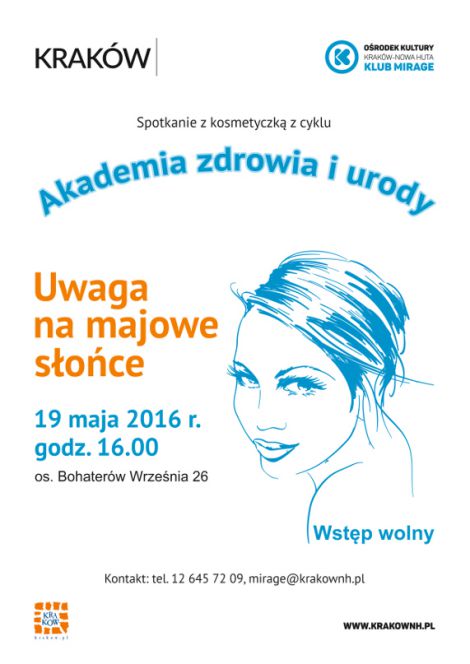 Spotkanie z konsultantkami kosmetycznymi dla pań w ramach cyklu Akademia Zdrowia i Urody, które odbywają się w Klubie Mirage Ośrodka Kultury Kraków-Nowa Huta (os. Bohaterów Września 26). W najpiękniejszym miesiącu - maju, a dokładniej 19 maja o godz. 16:00 mówić będziemy o szkodliwych właściwościach nieumiejętnego korzystania ze słońca. Poświecimy także czas na rozmowę o maseczkach do twarzy, które bywają często postrzegane jako zbędne lub nieskuteczne a w rzeczywistości są jednym z ważniejszych elementów rytuału pielęgnacyjnego. Każdy doświadczony ekspert powie nam, że ich regularne stosowanie jest niezbędne aby zapewnić skórze blask. Na spotkaniu kosmetyczka przybliży typy maseczek i dobierze je do cery. Przedstawi również kilka przepisów na sprawdzone domowe maseczki oraz udzieli indywidualnych porad.