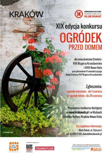 Klub Dukat Ośrodka Kultury Kraków-Nowa Huta (ul. Styczna 1) zaprasza mieszkańców Dzielnic XVII Wzgórza Krzesławickie i XVIII Nowa Huta do udziału w kolejnej, dziewiętnastej już edycji konkursu Ogródek przed domem. Ogrody można zgłaszać w dwóch kategoriach, w następujących terminach: ogrody wiosenne - do dnia 01.06.2016 r. oraz ogrody letnie - do dnia 24.06.2016 r. (z możliwością przedłużenia terminów). Regulamin konkursu i karty zgłoszenia dostępne są w Klubie Dukat oraz na www.krakownh.pl.