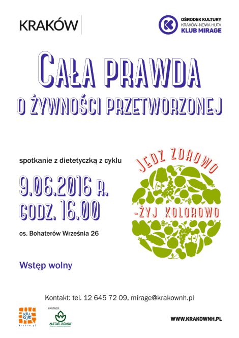 Co kryje się pod pojęciem przetworzonej żywności? Czy jest zdrowa czy wręcz przeciwnie, jakie ma zalety a jakie wady? Na te i inne pytania odpowiedzą eksperci z Centrum Dietetycznego Naturehouse. Klub Mirage Ośrodka Kultury Kraków-Nowa Huta (os. Bohaterów Września 26) serdecznie zaprasza na kolejne spotkanie z cyklu Jedz zdrowo-żyj kolorowo promujące zdrowy styl życia, które odbędzie się 9 czerwca o godz. 16:00.