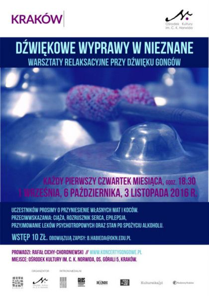 Prosimy także pamiętać o przeciwwskazaniach w uczestniczeniu w koncertach gongów. Są nimi: ciąża, rozrusznik serca, epilepsja, przyjmowanie leków psychotropowych oraz stan po spożyciu alkoholu.