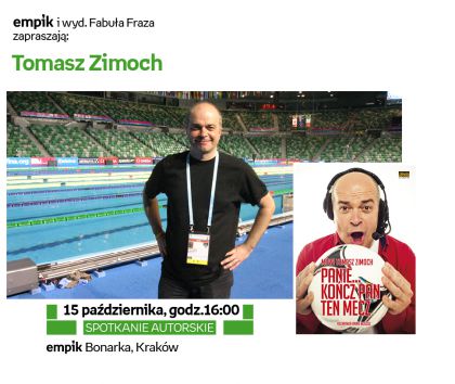 Tomasz Zimoch to legenda polskiego sportu. Nikt tak emocjonalnie jak on nie podchodził do komentowania meczów. W książce „Mówi Tomasz Zimoch. Panie... kończ Pan ten mecz” (wyd. Fabuła Fraza) opowiada o swojej miłości do sportu i radia. Tomasza Zimocha będzie można spotkać 15 października w salonie Empik Bonarka.