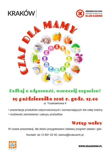 Czas dla mamy - to nowy cykl spotkań dla kobiet w Klubie Karino Ośrodka Kultury Kraków-Nowa Huta na ul. Truskawkowej 4. Wszystkie mamy zapraszamy razem z dziećmi, będą mogły one spokojnie skorzystać z przygotowanej dla nich oferty, ponieważ podczas spotkań dzieci ciekawie spędzą czas pod okiem instruktorów Klubu Karino. Pierwsze spotkanie odbędzie się 19 października o godz. 17:00 i poświęcone będzie zdrowiu całej rodziny, gdzie zostaną przybliżone produkty, które pozwolą w naturalny sposób wzmocnić organizm przed zimą, zadbać o jego odporność i witalność. Na spotkaniu będzie również możliwość zakupu takich produktów.