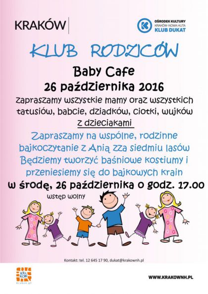 Baby Café to cotygodniowe spotkania w kawiarence Klubu Rodziców w Klubie Dukat Ośrodka Kultury Kraków-Nowa Huta (ul. Styczna 1). 26 października tematem spotkania będzie rodzinne poznawanie literatury i kształtowanie nawyku czytania - będzie bajkoczytanie w wykonaniu rodziców oraz wspólne tworzenie kostiumów bohaterów bajek z prostych materiałów. Serdecznie zapraszamy w godz. 17.00-19.00.