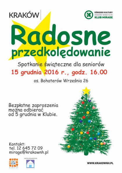 Święta Bożego Narodzenia to najbardziej uroczyste i wzruszające święta w naszej tradycji. Święta, na które wszyscy czekają z utęsknieniem. Klub Mirage Ośrodka Kultury Kraków-Nowa Huta (os. Bohaterów Września 26) zaprasza wszystkich seniorów na uroczyste spotkanie świąteczne w Klubie Seniora w czwartek 15 grudnia o godz. 16.00. W atmosferze ciepła i wzajemnej sympatii oraz przy dźwiękach najpiękniejszych kolęd rozpocznie się ten cudowny świąteczny czas. Radosne przedkolędowanie będzie okazją, by złożyć sobie życzenia oraz skosztować tradycyjnych bożonarodzeniowych potraw. Zapraszają Klub Mirage oraz Spółdzielnia Mieszkaniowa Mistrzejowice-Północ.