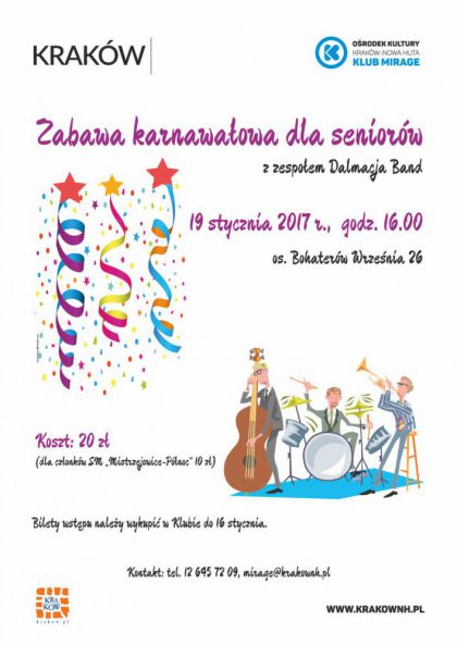 Klub Mirage Ośrodka Kultury Kraków-Nowa Huta (os. Bohaterów Września 26) zaprasza seniorów na Zabawę karnawałową 19 stycznia o godz. 16.00. Okres karnawału w pełni. Już dziś można zacząć planować w jakiej atmosferze będziemy go spędzać. Tych, którzy chcą go świętować w szampańskim nastoju i przy skocznej muzyce zaprasza Klub Mirage Ośrodka Kultury Kraków-Nowa Huta, gdzie tradycyjnie odbędzie się zabawa karnawałowa dla seniorów przy muzyce na żywo. Do tańca przygrywać będzie zespół Dalmacja Band, który umili wieczór dobrą muzyką oraz wspaniałym humorem.