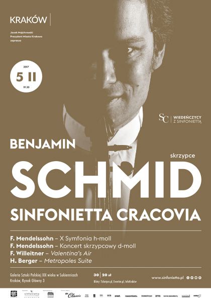 Orkiestra Stołecznego Królewskiego Miasta Krakowa Sinfonietta Cracovia współpracowała już z wiedeńskimi artystami tej miary, co Rainer Honeck - koncertmistrz słynnej orkiestry Filharmoników Wiedeńskich, czy Stefan Vladar - doskonały pianista i główny dyrygent prestiżowej Wiener KammerOrchester. Tym razem Sinfonietta Sinfonietta wystąpi z Benjaminem Schmidem - światowej sławy austriackim wirtuozem skrzypiec. Schmid - na stałe związany z rodzinnym miastem Mozarta, Salzburgiem - urodził się i wykształcił w Wiedniu. Do historii przeszły jego występy z orkiestrą Filharmoników Wiedeńskich pod batutą tak znakomitych dyrygentów jak Seiji Ozawa czy Valery Gergiev - słynny Sommernachtskonzert w wiedeńskim pałacu Schönbrunn z jego udziałem, prowadzony przez tego Gergieva, zgromadził przeszło stotysięczną publiczność i był transmitowany na całym świecie.