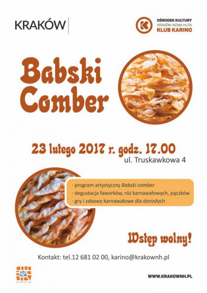 Klub Karino Ośrodka Kultury Kraków-Nowa Huta (ul. Truskawkowa 4) po raz kolejny zaprasza na spotkanie kultywujące tradycje Tłustego Czwartku, czyli Babski Comber. Imprezie towarzyszyć będą wesołe zabawy karnawałowe i degustacja tłustoczwartkowych specjałów. Na stołach królować będą pączki, faworki i różane ciasteczka. Program artystyczny przygotowali aktywni seniorzy z Klubu Karino. W blasku świec, poznamy historię Tłustego Czwartku oraz ciekawostki o krakowskich handlarkach, które w Tłusty Czwartek wywoływały popłoch wśród mężczyzn. Od urodziwych żądały buziaka a od bogatych dworzan i urzędników – datków. Podczas imprezy nie zabraknie zabaw ze słomianą kukłę, zwaną combrem, kultywujących obrzędy krakowskie. Impreza nie tylko dla Pań odbędzie się w czwartek 23.02. o godz. 17.00!