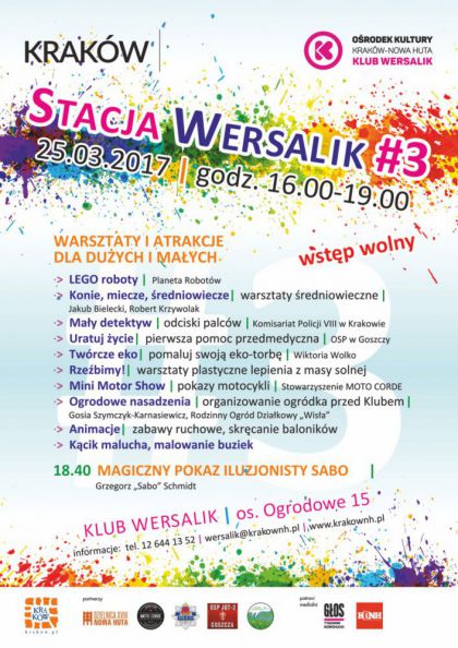 Podczas tegorocznej edycji Stacji Wersalik Klub przygotował atrakcyjne propozycje. Wśród nich Planeta Robotów – gdzie zgłębić będzie można technologię Lego robotów. To połączenie techniki i dobrej zabawy, polecane szczególnie chłopcom – tym małym i tym większym. Konie, miecze, średniowiecze – to propozycja warsztatów historycznych, które przeniosą uczestników w czasy rycerstwa i gotyku. Małych fanów Sherlocka Holmesa, Klub zaprasza do udziału w warsztatach prowadzonych przez policjantów z Komisariatu VIII w Krakowie, podczas których dzieciaki spróbują swoich sił m.in. w zbieraniu odcisków palców. Na wszystkich, którzy będą chcieli wyżyć się twórczo, czekać będą eko-warsztaty plastyczne i warsztaty rzeźbienia z masy solnej. Dla fanów motoryzacji nie lada gratką będzie Mini Motor Show – pokaz przygotowany przez Stowarzyszenie MOTO CORDE. W programie zaplanowano także wspólne organizowanie ogródka i sadzenie kwiatów przed Klubem, rozmaite zabawy ruchowe i animacje. Dla najmłodszych nie zabraknie malowania buziek i kącika, w którym maluszki będą mogły zająć się rysowaniem i kolorowaniem.