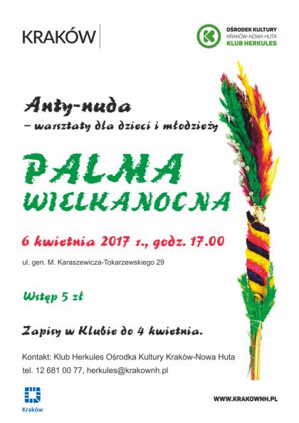 Masz wolny czas? Przyjdź do nas! Klub Herkules Ośrodka Kultury Kraków-Nowa Huta (ul. Gen. M. Karaszewicza-Tokarzewskiego 29) zaprasza na cykl warsztatów "Anty-nuda" dla dorosłych, dzieci i młodzieży. W trakcie najbliższych warsztatów uczestnicy nauczą się, jak wykonać krok po kroku palmę wielkanocną. Tradycyjne palmy przygotowywano się z gałązek wierzby, która w symbolice Kościoła jest znakiem zmartwychwstania i nieśmiertelności duszy. Obok wierzby używano również gałązek malin i porzeczek. W trzpień palmy wplatano bukszpan, barwinek, borówkę, cis, widłak.