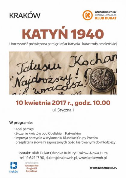 10.04. o godz. 11.00 odbędzie się uroczysty apel poległych, złożenie kwiatów i zapalenie zniczy pod kamieniem katyńskim na terenie Klubu Dukat Ośrodka Kultury Kraków-Nowa Huta (ul. Styczna 1). Spotkanie uświetni program poetycki w wykonaniu Klubowej Grupy Poetica. W obchodach wezmą udział przedstawiciele Rady Dzielnicy XVII Wzgórza Krzesławickie, mieszkańcy Grębałowa i okolicy oraz młodzież ze szkół podstawowych i gimnazjalnych dzielnicy XVII z pocztami sztandarowymi. Słowa do młodzieży skierują panowie Sławomir Pietrzyk i Maciej Miezian oraz kombatanci.