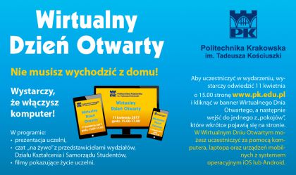 Zapraszamy wszystkich kandydatów na studia na Wirtualny Dzień Otwarty, który odbędzie się we wtorek 11 kwietnia w godzinach 15.00-17.00 i pozwoli Wam poznać Politechnikę Krakowską.