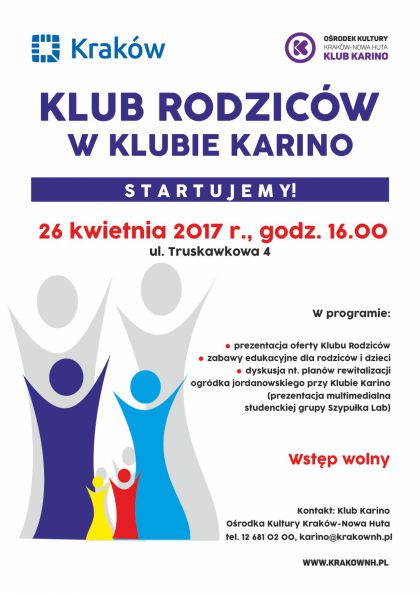 Klub Karino Ośrodka Kultury Kraków-Nowa Huta (ul. Truskawkowa 4) zaprasza rodziców i dzieci na spotkanie organizacyjne nowo powstałego Klubu Rodziców.