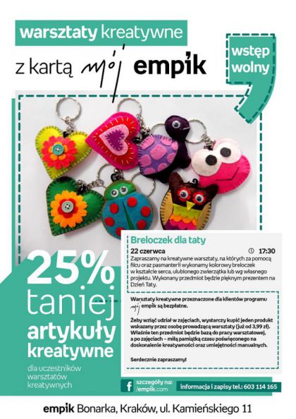 Zapraszamy na kreatywne warsztaty, na których za pomocą filcu oraz pasmanterii wykonamy kolorowy breloczek w kształcie serca, ulubionego zwierzątka lub wg własnego projektu. Wykonany przedmiot będzie pięknym prezentem na Dzień Taty. Zapisy pod nr. tel.: 603 114 165.