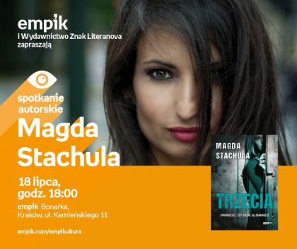 Magda Stachula, autorka jednego z najlepiej sprzedających się debiutów kryminalnych ostatnich lat, wraca z nową historią. Autorka thrillerów psychologicznych zadebiutowała powieścią „Idealna”, która odniosła duży sukces i stała się jednym z najgłośniejszych debiutów w 2016 roku . „Trzecia” (Znak Literanova) to najnowsza książka w dorobku krakowskiej Autorki. Akcja rozgrywa się głównie w scenerii Krakowa, przeplatając losy trójki bohaterów. Na premierowe spotkanie z Magdą Stachulą zapraszamy do krakowskiego salonu empik Bonarka.