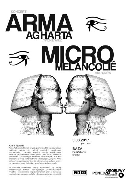 Arma Agharta to litewski artysta-performer, którego dźwiękowe działania sytuują się gdzieś pomiędzy dadaizmem, improwizacją i zupełnie poważną muzyką współczesną. Podczas peformansów używa głosu oraz starej sowieckiej elektroniki i przeróżnych obiektów akustycznych. Nie bez znaczenia jest też performatywna strona jego występów: Arma za każdym razem prezentuje się w innym, absurdalnym stroju i przygotowuje pełną dadaistycznego humoru choreografię.
