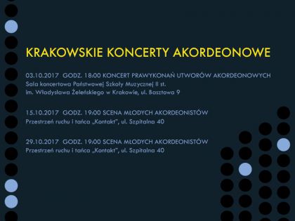 o godz. 18:00 w sali koncertowej Państwowej Szkoły Muzycznej II st. im. Władysława Żeleńskiego, ul. Basztowa 9 w Krakowie. Wydarzenie ma na celu prezentację wysokiej jakości artystycznych kompozycji z udziałem akordeonu, jeszcze nie prezentowanych publicznie. W IV edycji koncertu zostaną wykonane utwory: Zbigniewa Bargielskiego, Bożeny Boba-Dyga, Piotra Peszata, Szymona Strzelca, Rafała Wnuka oraz Macieja Zimki. W programie: Zbigniew Bargielski: Kilka minut obecności na sopran i akordeon, Maciej Zimka: Sonata na akordeon i gitarę, Szymon Stanisław Strzelec : In Shadow World We Hide in Light na dwa akordeony i warstwę elektroakustyczną, Piotr Peszat: Jenny’s Soul. Or Dirks #2 na akordeon ćwierćtonowy, audioplayback i wideo, Rafał Wnuk: Suita tańców wirtualnych na klarnet, wiolonczelę i akordeon, Bożena Boba-Dyga: Utwór na konserwatorów, konferansjera i akordeon w roli drugoplanowej. Wykonawcami koncertu będą: Wiesław Ochwat (akordeonista, zwycięzca wielu prestiżowych nagród na konkursach instrumentalnych, obecnie doktorant Akademii Muzycznej w Krakowie), Maciej Zimka (akordeonista