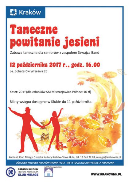 Klub Mirage Ośrodka Kultury Kraków-Nowa Huta (os. Bohaterów Września 26) zaprasza seniorów na Taneczne powitanie jesieni w czwartek 12 października o godz. 16.00. Zbliża się jesień, ale to nie powód, żeby się smucić. Jak co roku Klub zaprasza seniorów na zabawę taneczną, by powitać tę porę roku muzycznie, tanecznie i z przytupem. Zagra zespół Szwajca Band. Współorganizatorem jest Spółdzielnia Mieszkaniowa Mistrzejowice-Północ.