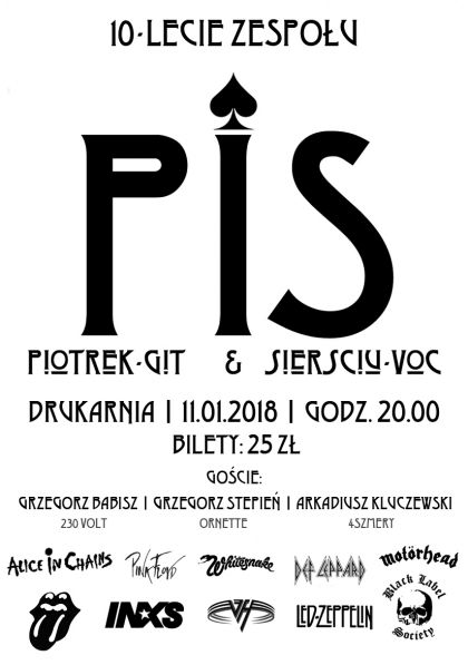 PiS (Piotrek i Sierściu), to duet akustyczny współtworzony przez Roberta „Sierścia” Mastalerza, wokalistę znanego z grupy 4Szmery i Piotrka Lekkiego, gitarzystę, realizatora dźwięku i producenta (na koncie ma nominację do Fryderyka 2012 z płytą Agressivy 69 „Republika 69″ której był współproducentem i realizatorem). Jako gitarzysta współpracował między innymi z Piotrem Żaczkiem, Januszem Radkiem, Mirkiem Szpilką, Wojtkiem Feciem w grupie Obcy, a ostatnio z Pawłem „Bejbim” Mąciwodą (basista Scorpions) w jego projekcie Stirwater którego płytę również zrealizował, a jedna z piosenek zatytułowana „Water water” zajmowała miejsce w czołówce Listy Przebojów Trójki). Muzycy wykonują akustyczne wersje największych światowych przebojów : Led Zeppelin, Deep Purple, Bon Jovi, Van Halen, Whitesnake,Alice in Chains, INXS.Duet ma na koncie otwieranie koncertów grupy Dżem, Stirwater czy Marka Piekarczyka. Zagrali kilka koncertów w legendarnej Muzycznej Owczarni, w 2012 roku otwierali koncert amerykańskiej wokalistki bluesowej Wandy Johnson na Festiwalu Legend Rocka w Dolinie Charlotty. W czerwcu 2013 roku otwierali koncerty jednego z najlepszych gitarzystów na świecie Richie Kotzena (Poison) oraz Johna Corabiego (Motley Crue) w krakowskim klubie Lizad King .W 2015 roku Piotr zorganizował pierwszą "Klinikę gitarową w Bochni" ,na której zajęcia poprowadził Ron "Bumblefoot" z Guns N' Roses. Duet koncertuje nieprzerwanie od 10 lat i 11 stycznia wraca do Klubu "Drukarnia", gdzie w 2008 roku zagral pierwszy koncert, który nagłaśniał nieodżałowany Włodek "Sprężyna" Czachor. Gościnnie z zespołem wystąpią Przyjaciele Muzyków Grzegorz Babisz (230 VOLT) Grzegorz "Ornette" Stępień ( Oddział Zamknięty, ORNETTE) i Arkadiusz Kluczewski (4Szmery).
