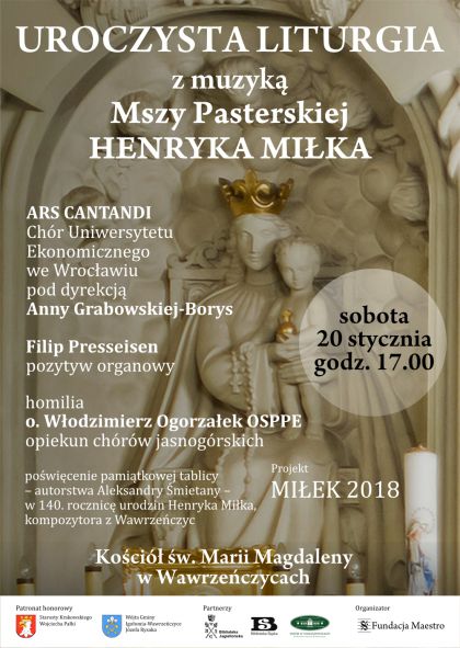 Zapraszamy na UROCZYSTĄ LITURGIĘ, podczas której zabrzmi MSZA PASTERSKA Henryka Miłka (1878-1943) i zostanie odsłonięta tablica pamiątkowa w 140. rocznicę urodzin, pochodzącego z Wawrzeńczyc, kompozytora.