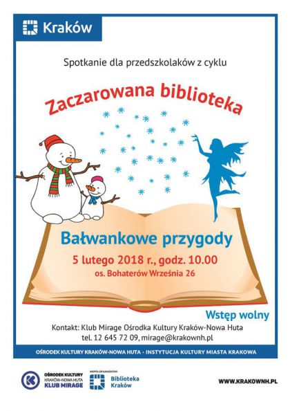 Ulepiony zimą przez chłopca Bałwanek martwi się tym, że wraz z nadejściem wiosny roztopi się. Pewnego dnia dowiedział się, że jest kraj, gdzie śnieg nigdy nie topnieje. Próbował się tam dostać, niestety bezskutecznie. O tym, jak Bałwankowi w końcu udało się dotrzeć na Biegun Północny dowiedzą się dzieci, które wezmą udział, w co miesięcznym spotkaniu z cyklu Zaczarowana biblioteka w Klubie Mirage Ośrodka Kultury Kraków-Nowa Huta w poniedziałek 5 lutego o godz. 10.00. Zajęcia dla maluchów w wiek 2-4 lata.