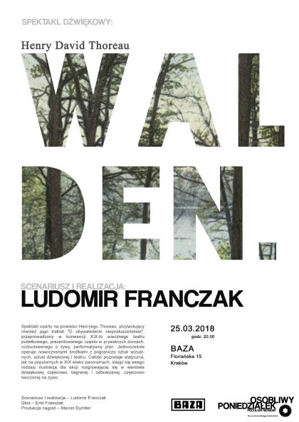 Tytułowy WALDEN jest stawem w środku lasu, nad który 4 lipca 1845 roku wyniósł się Henry David Thoreau i gdzie mieszkał w samotności przez następne ponad dwa lata. W spektaklu staje się on symbolem miejsca odosobnienia, a jednocześnie ucieczki od doskwierającej rzeczywistości. Miejscem, gdzie w spokoju można przemyśleć i przetestować nowy model życia.