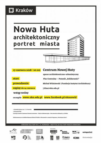 Spacer architektoniczno-urbanistyczny po centrum Nowej Huty w ramach projektu „Nowa Huta – architektoniczny portret miasta”. Prowadzenie: Michał Wiśniewski (Fundacja Instytut Architektury). Wstęp wolny. Obowiązują zapisy.